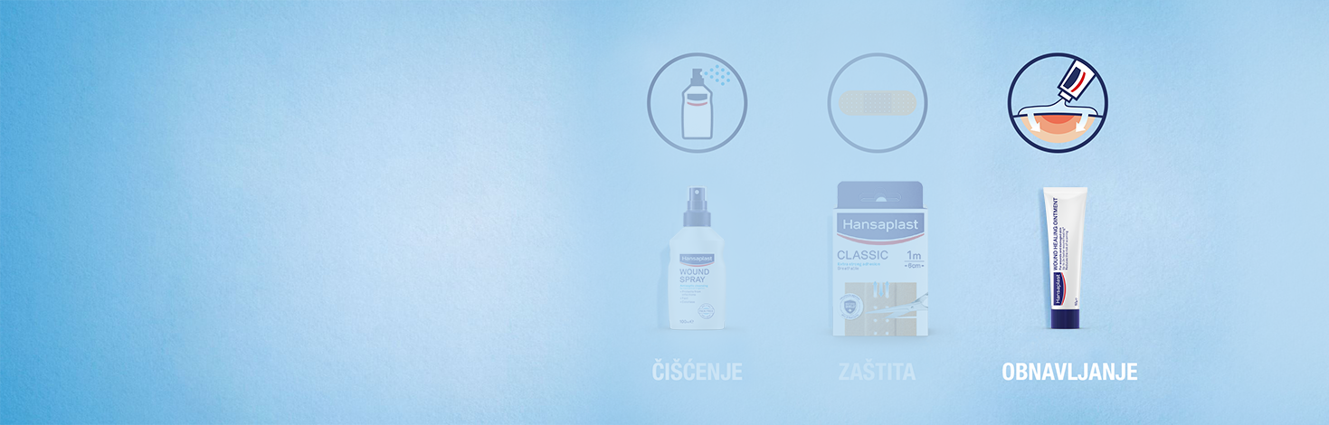 Sljedeći korak je zaštititi površinsku ozljedu od vanjskih utjecaja kao što su prljavština i bakterije kako bi se osiguralo neometano obnavljanje kože. Prekrijte površinsku ranu Hansaplast flasterom koji najviše odgovara vašim potrebama.
